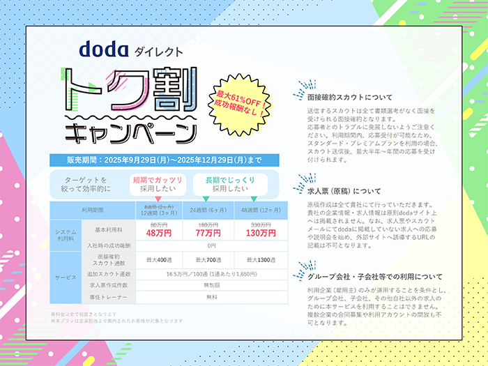 「doda ダイレクト」をお考えの企業様にお得なキャンペーンのご案内です。ぜひご検討くださいませ。