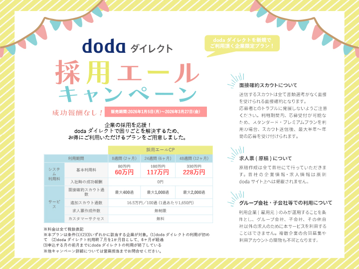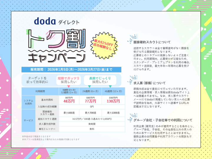 dodaで求人広告掲載をお考えの企業様にお得なキャンペーンのご案内です。